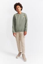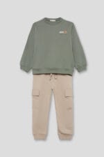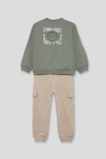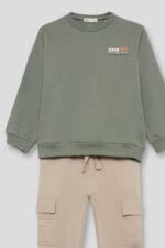 Conjunto de niño con sudadera verde y pantalón beige tipo cargo, ideal para el día a día. Diseño Street Monkey con mensaje «Join Me» y dibujo trasero.