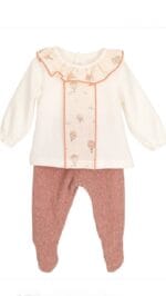 Conjunto para bebé niña de la marca Calamaro, ideal para la temporada de otoño-invierno. La parte superior es una camiseta de manga larga en tono crudo, con cuello volante y detalle central en tejido estampado con globos aerostáticos. El pantalón es tipo canalé, muy suave y cómodo, en color maquillaje, con pies cerrados para mantenerla calentita.