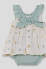 Vestido de bebé con estampado de animales en tono crudo, volante verde agua y braguita a juego. Dulce, fresco y perfecto para los días de primavera y verano.