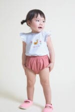 La camiseta está confeccionada en algodón suave y ligero, ideal para la piel sensible del bebé. La braguita con cinturilla elástica garantiza comodidad y libertad de movimiento.