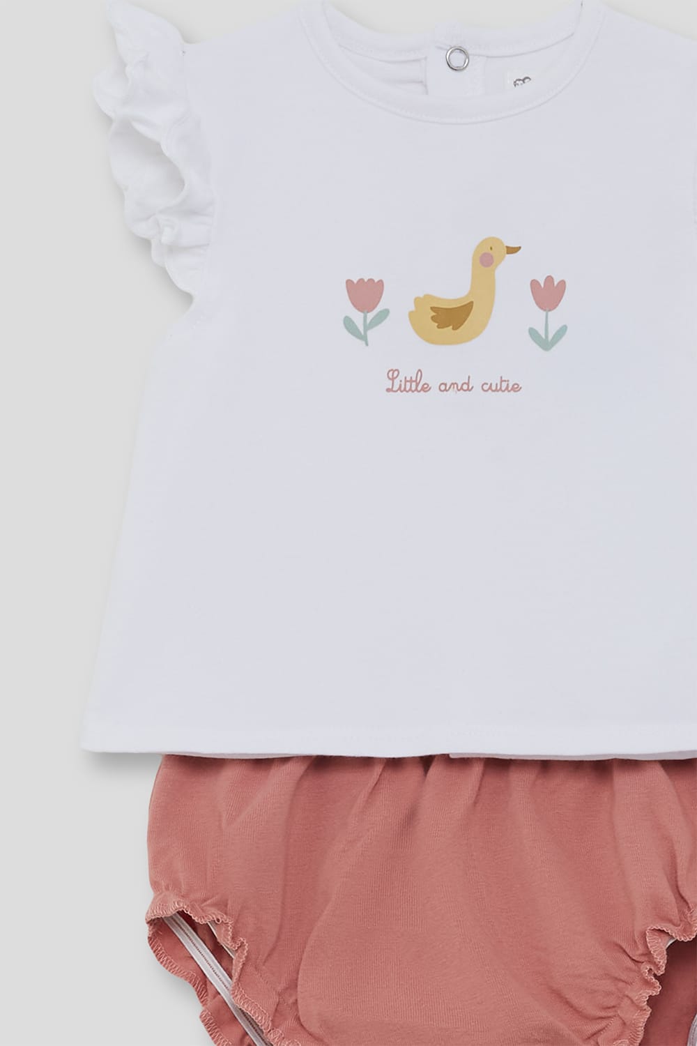 Este conjunto de Street Monkey incluye camiseta blanca con volante en las mangas y un delicado estampado de patito con flores, combinado con braguita elástica en tono rosa empolvado.