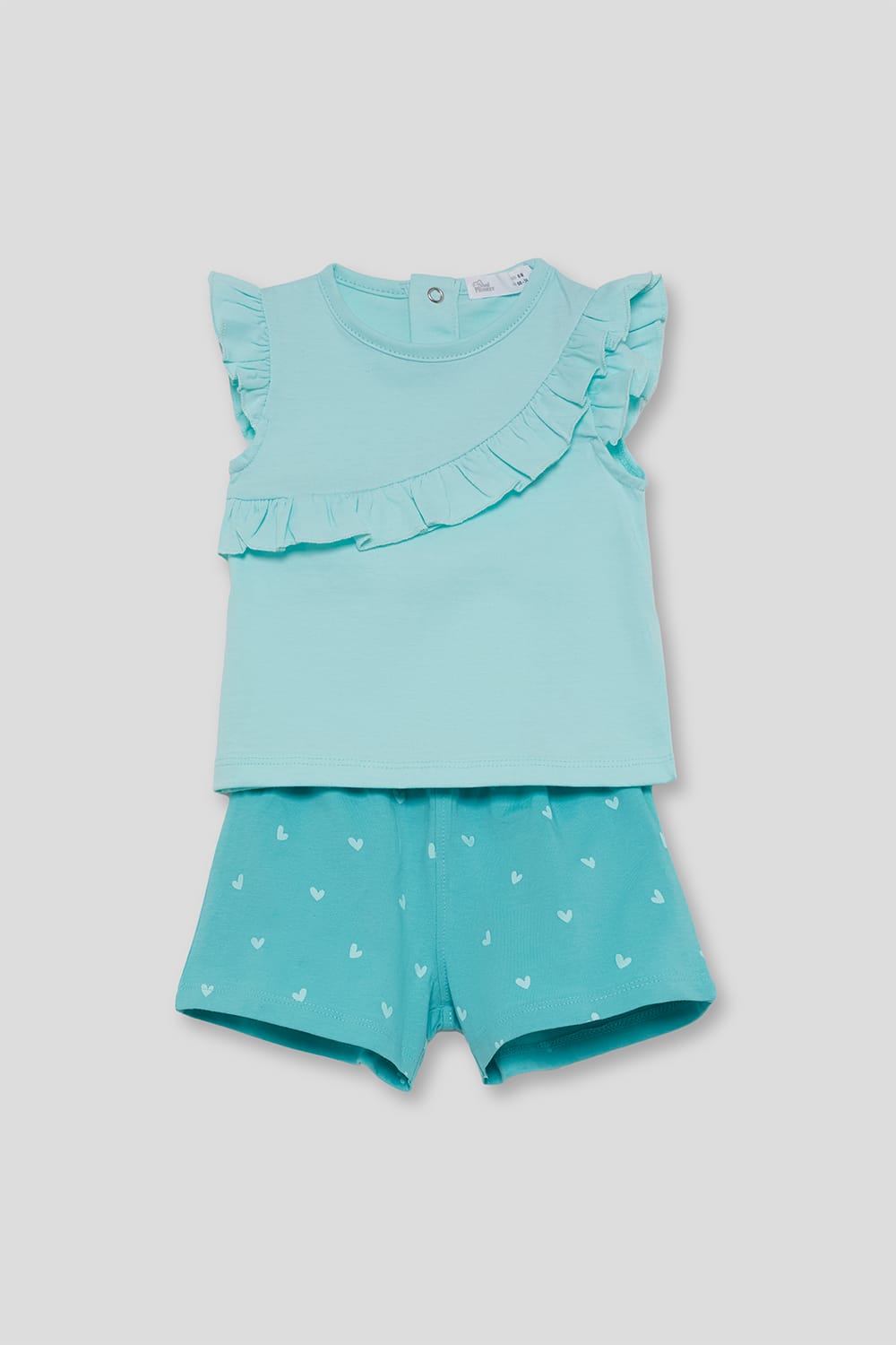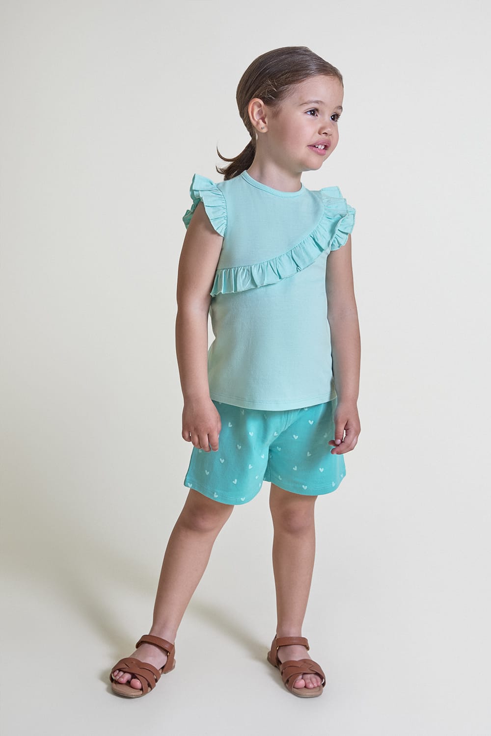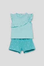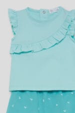 Conjunto infantil en color verde agua compuesto por camiseta con volante decorativo y short estampado de corazones. Fresco, cómodo y perfecto para el verano.