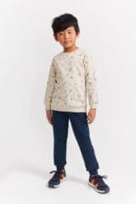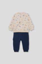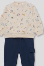 Conjunto infantil con sudadera beige estampada de motivos espaciales y pantalón azul marino con bolsillo lateral. Ideal para el día a día.
