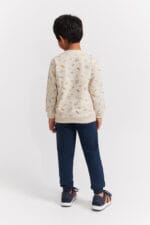 La sudadera en color beige está decorada con un alegre estampado de motivos espaciales: cohetes, planetas, estrellas y mensajes como «cool», «fun» o «yeah!», en tonos naranja, azul y negro. El cuello, puños y bajo son elásticos para mayor comodidad.