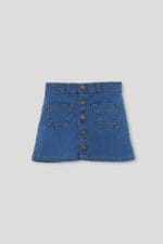 Falda vaquera para niña en tono denim azul, con cierre frontal de botones y bolsillos delanteros. Un básico cómodo y versátil para el día a día.