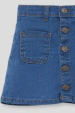 Falda vaquera para niña confeccionada en denim azul de tacto suave y cómodo. Presenta diseño recto con cierre frontal de botones metálicos decorativos que aportan un toque moderno y práctico.