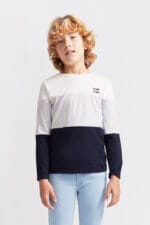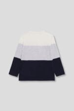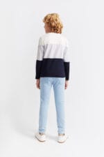 Jersey de niño de la colección otoño-invierno con un diseño moderno a franjas horizontales en tonos crudo, gris vigoré y azul marino. Confeccionado en un tejido suave y cómodo, es perfecta para el día a día o para combinar con jeans y deportivas. Presenta un pequeño bordado en el pecho con la inscripción “STMK TEAM”, añadiendo un toque urbano y juvenil. Disponible en tallas desde los 4 hasta los 16 años.