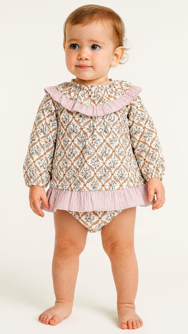 Jesusito para bebé con estampado geométrico floral en tonos tierra y detalle lila. Un conjunto dulce, cómodo y elegante, ideal para cualquier ocasión.