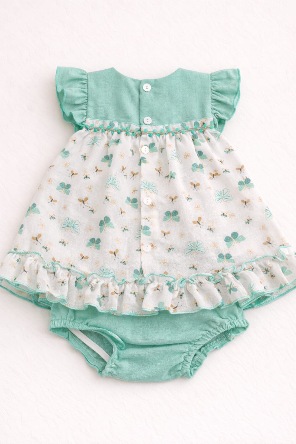 La parte superior en verde agua combina con un cuerpo estampado de mariposas y pequeños detalles florales en tonos suaves, creando un conjunto muy dulce y elegante.