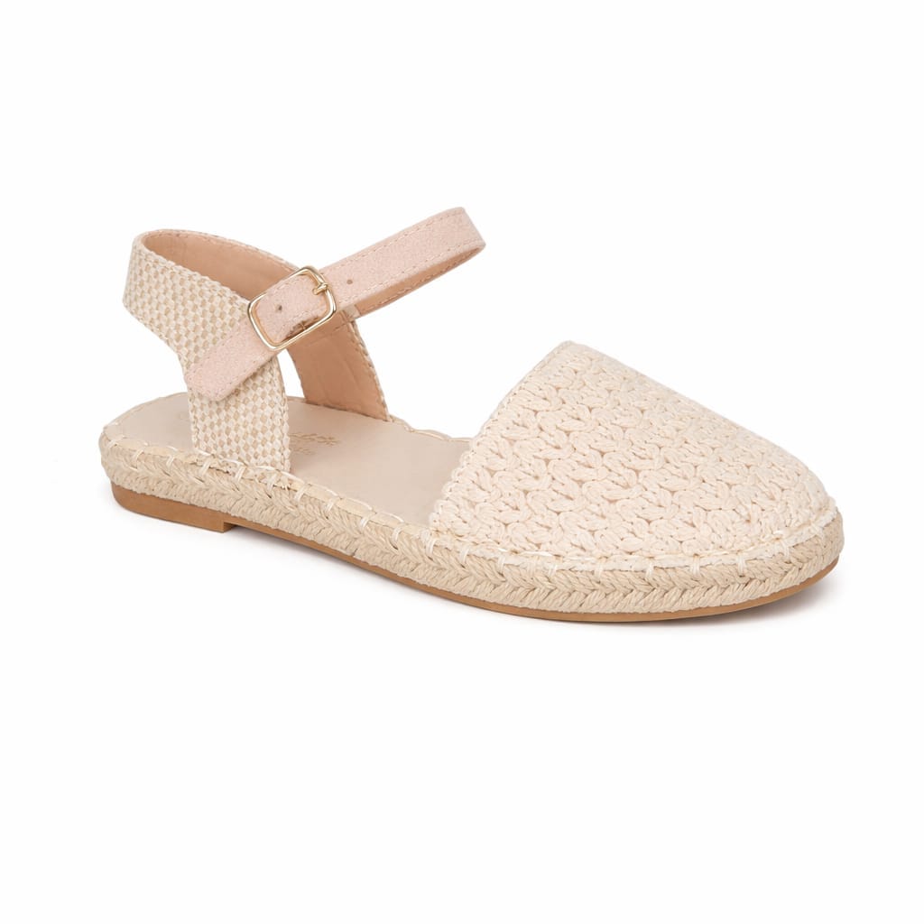 Menorquina infantil en tono beige con pala trenzada y cierre de pulsera con hebilla. Un calzado fresco, cómodo y elegante, perfecto para el verano y para combinar con vestidos o conjuntos más arreglados.