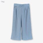 Confeccionado en un tejido ligero y fresco, este pantalón en color celeste destaca por su corte ancho y fluido, que aporta movimiento y un aire moderno. La cintura presenta un diseño cómodo con detalle decorativo de lazo en la parte frontal, añadiendo un toque delicado sin perder funcionalidad.