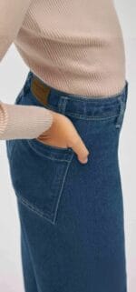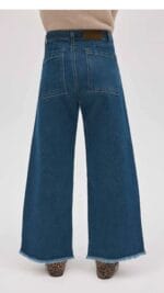 Fabricado en denim azul clásico, destaca por su corte ancho con bajo deshilachado y bolsillos traseros grandes que aportan un toque moderno.