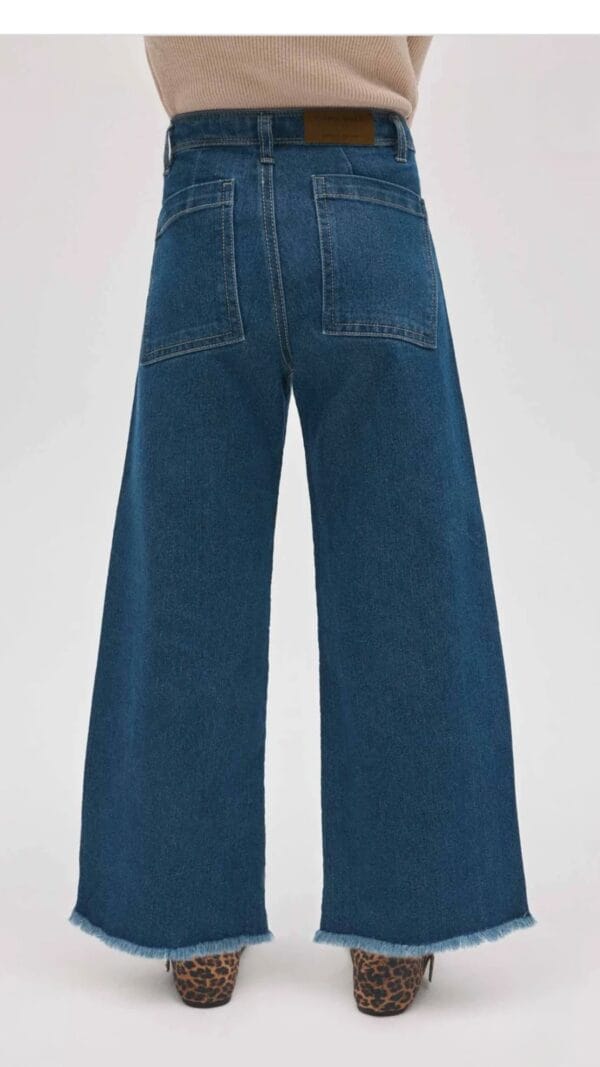 Fabricado en denim azul clásico, destaca por su corte ancho con bajo deshilachado y bolsillos traseros grandes que aportan un toque moderno.