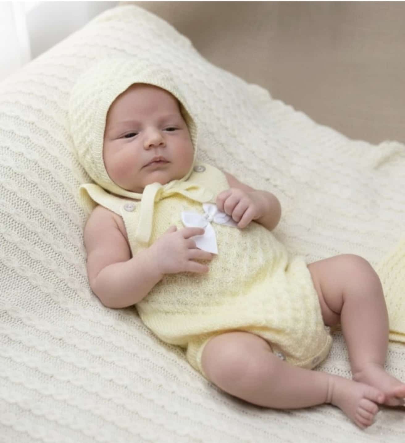El conjunto incluye pelele de tirantes con capota a juego, creando un look clásico y muy tierno. En la parte delantera destaca un bonito lazo decorativo, que aporta un toque elegante y delicado.
