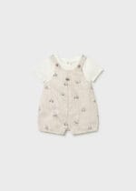 Combina el efecto de camiseta con peto en un solo conjunto, con tejido suave y ligero en tonos neutros. Destaca por su bonito estampado de ositos y rayitas, que le aporta un estilo dulce y muy actual.