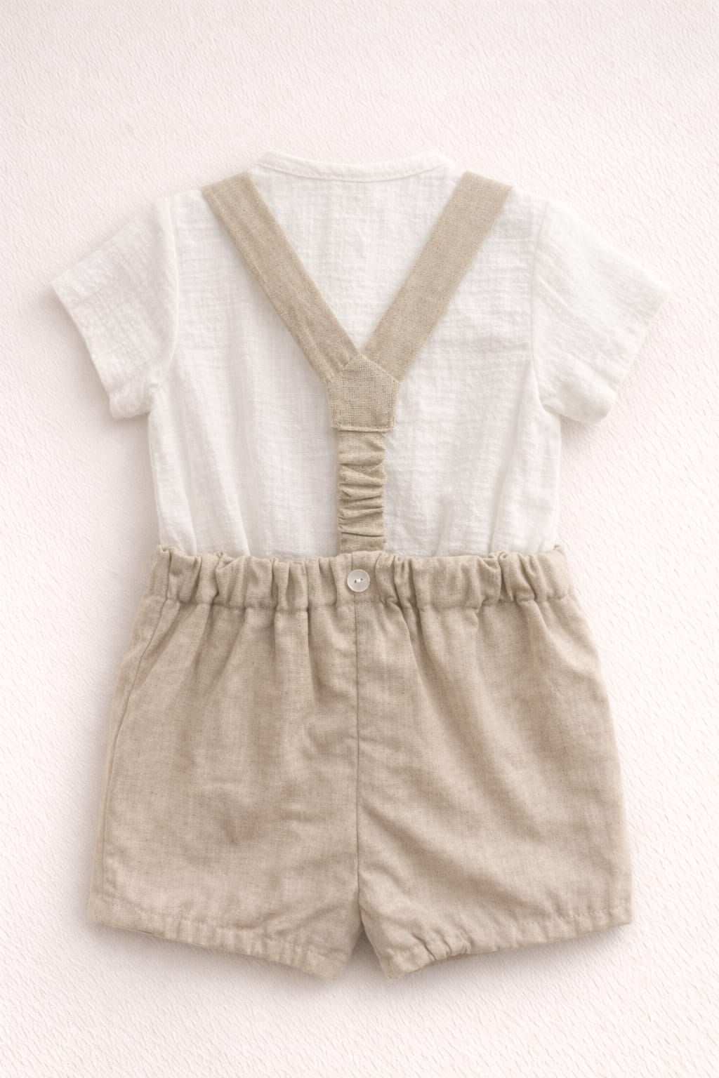 Peto bebé en tonos lino natural compuesto por camisa de manga corta y pantalón corto con tirantes. Un diseño elegante y fresco ideal para verano, celebraciones o looks especiales.