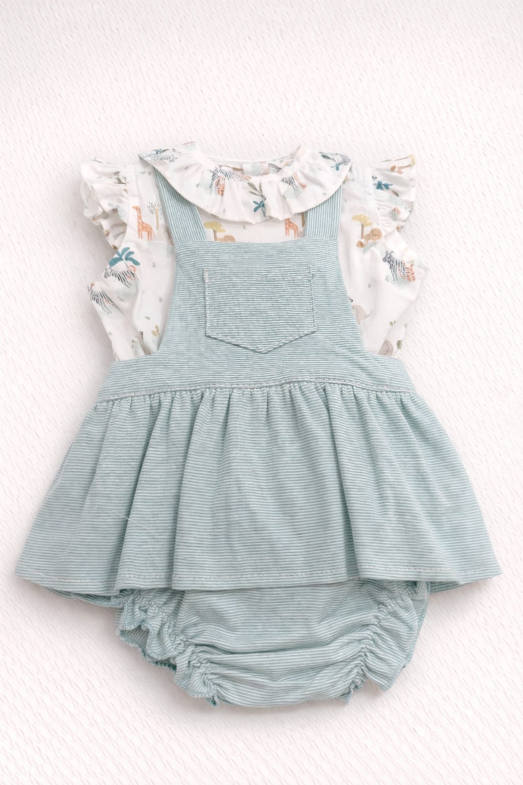 Dulce conjunto de peto con camisa estampada para bebé niña, en tonos verde agua y marfil. Ideal para entretiempo, cómodo y con un diseño delicado lleno de encanto. De 6 a 36 meses.