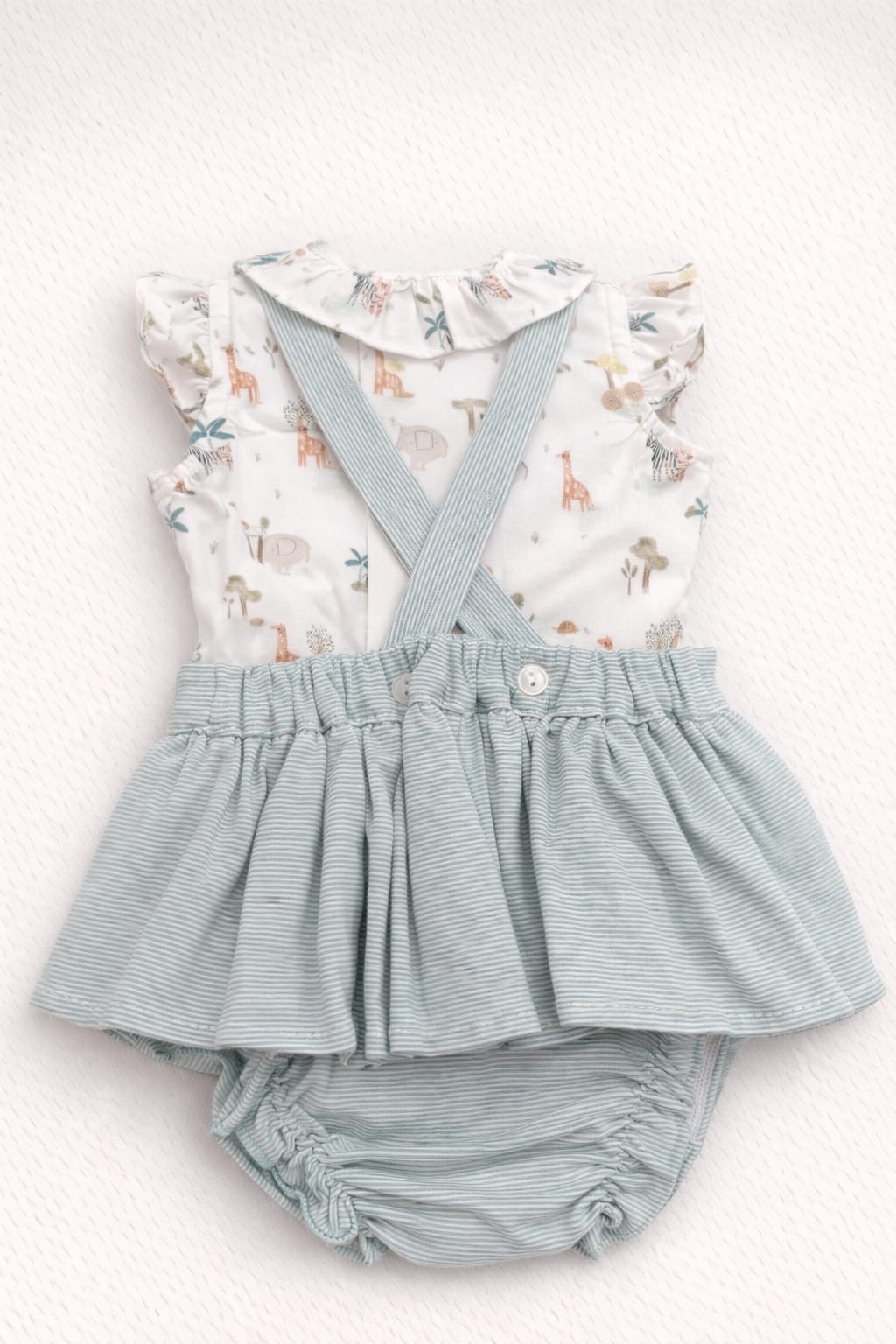 El diseño combina dulzura y comodidad, perfecto para entretiempo. La faldita del peto aporta volumen y movimiento, mientras que la braguita garantiza que el pañal quede bien cubierto.