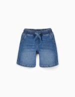 Bermuda vaquera para niño en denim azul, con cintura elástica y cordón ajustable. Diseño cómodo y versátil, ideal para el uso diario en verano.