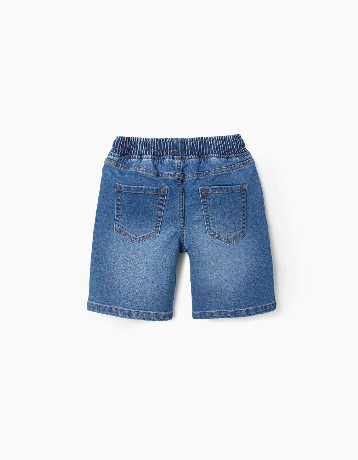 Bermuda vaquera para niño en denim azul, con cintura elástica y cordón ajustable. Diseño cómodo y versátil, ideal para el uso diario en verano.