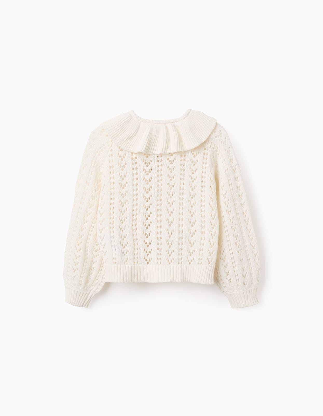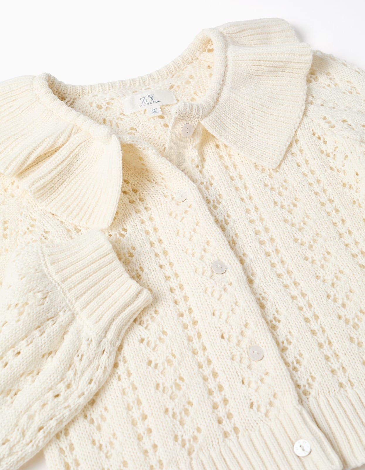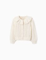 Chaqueta de punto calado para niña, en tono crudo, con precioso cuello volante que aporta un aire dulce y elegante. Perfecta para combinar con vestidos, conjuntos o looks más especiales.