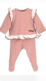 Pelele de bebé niña en color rosa maquillaje con delicados volantes estampados. Diseño cómodo y abrigado, ideal para los primeros meses. Colección Céfiro de Calamaro.