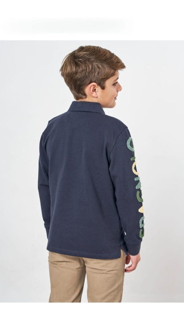 Polo de manga larga en azul marino con detalle bordado y letras en la manga. Un básico elegante y cómodo para cualquier ocasión.