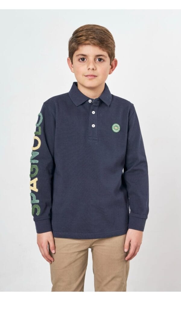 Polo Spagnolo para niño en color azul marino, con detalle bordado en el pecho y texto en relieve “SPAGNOLO” en la manga.