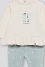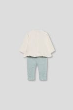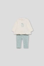 Conjunto de camiseta blanca con volante y estampado de patitos + polaina verde con dibujos a juego. Suave, cómodo y perfecto para bebés de 1 a 24 meses. Marca Street Monkey – Ref. 351034.