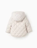 Chaquetón acolchado para bebé, en color crudo, con diseño de rombos y capucha con interior de pelo suave. Ideal para mantener el calor en los días fríos. Tallas de 6 a 36 meses.