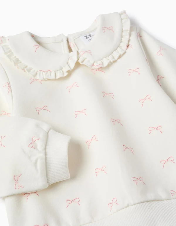 Conjunto de dos piezas para bebé niña de la marca Zippy. Incluye una sudadera blanca con pequeños lacitos estampados y cuello bebé con volante decorativo, y un pantalón largo en color rosa claro. Una opción dulce y práctica para el día a día, fabricada con tejido suave y cómodo para cuidar la piel de tu peque.