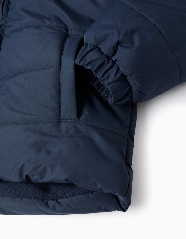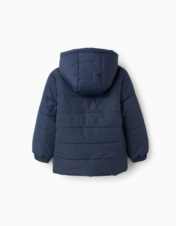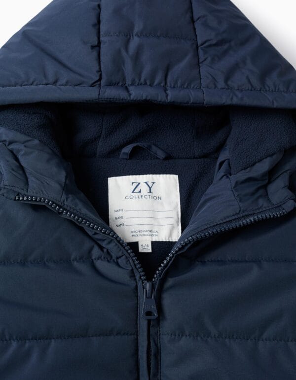 Abrigo acolchado infantil de la marca Zippy, en color azul marino. Diseñado para ofrecer abrigo y comodidad en los meses más fríos, incorpora una capucha fija y forro interior tipo borreguito muy suave al tacto. Cuenta con cierre frontal de cremallera, puños elásticos y bolsillos laterales para proteger las manos del frío. Una prenda práctica y versátil para el invierno. Disponible desde la talla 3/4 hasta la 13/14 años.