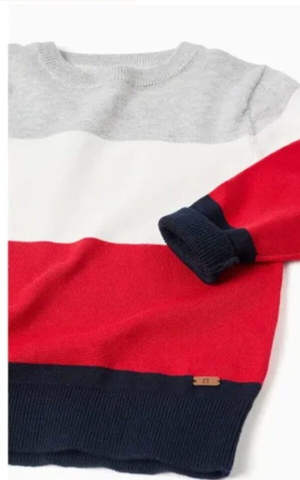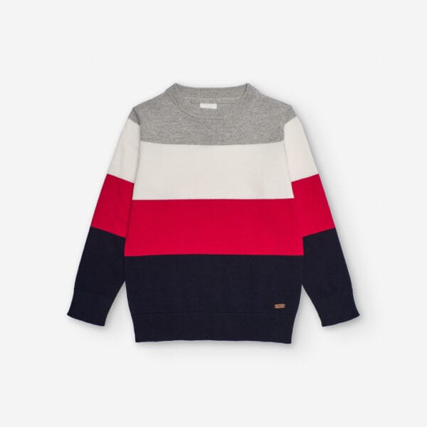 Jersey para niño de la marca Zippy con franjas anchas en tonos azul marino, rojo, blanco y gris. Estilo moderno y tejido suave ideal para el invierno.