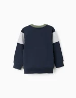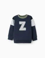 Sudadera de manga larga para niño en color azul marino, con cuello redondo y puños de canalé. Destaca por su diseño moderno con la letra “Z” en relieve en la parte frontal y detalles en verde y gris en las mangas. Confeccionada en felpa suave, ideal para el cole o para un look casual con estilo. Disponible desde la talla 3/4 hasta 13/14 años.