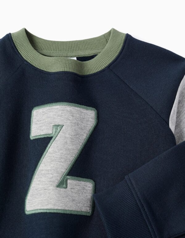 Sudadera de manga larga para niño en color azul marino, con cuello redondo y puños de canalé. Destaca por su diseño moderno con la letra “Z” en relieve en la parte frontal y detalles en verde y gris en las mangas. Confeccionada en felpa suave, ideal para el cole o para un look casual con estilo. Disponible desde la talla 3/4 hasta 13/14 años.