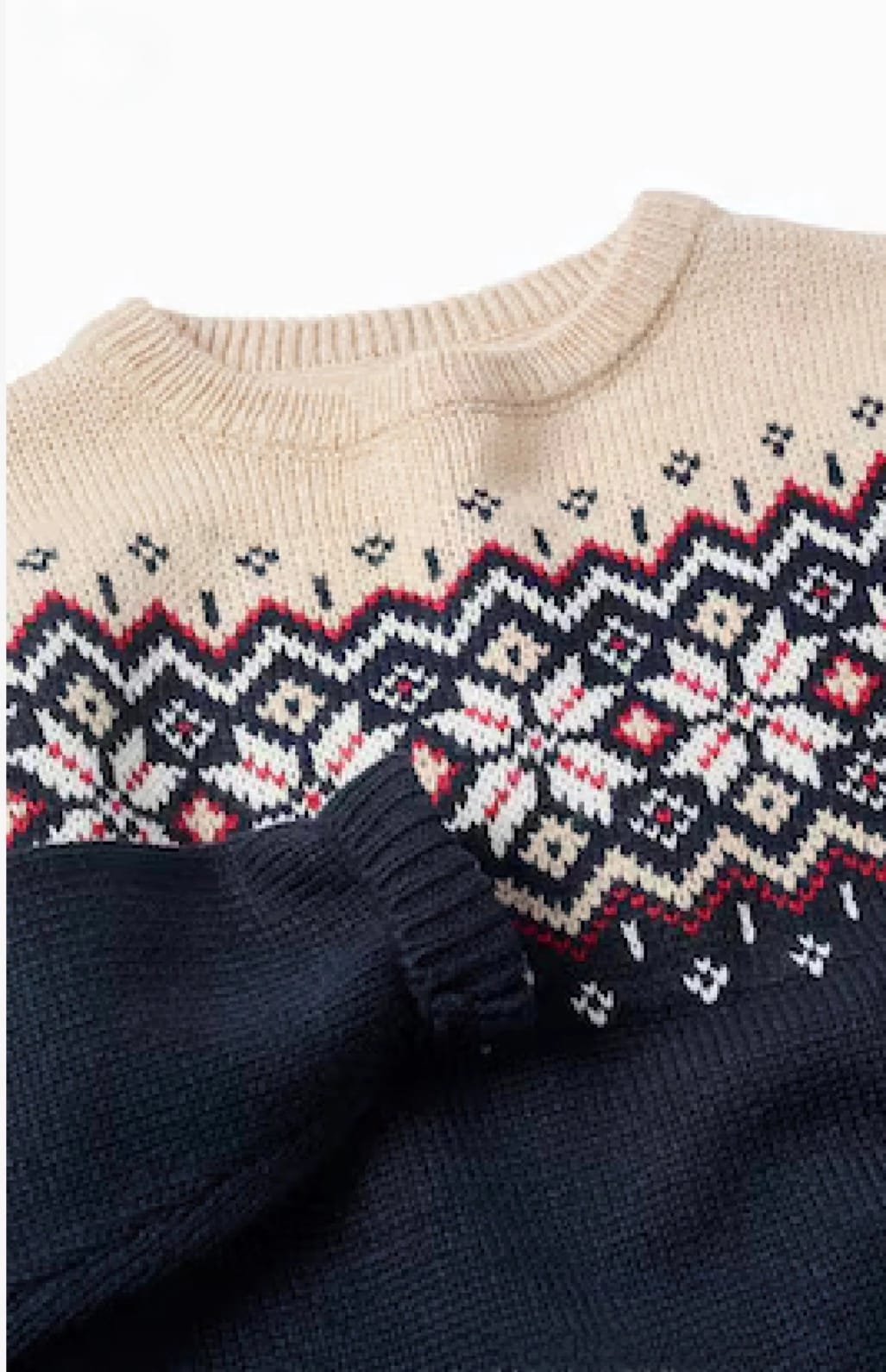 Jersey de punto para niño de la marca Zippy, en color azul marino con diseño nórdico en tonos beige, rojo y blanco. Ideal para las fiestas y los días fríos.