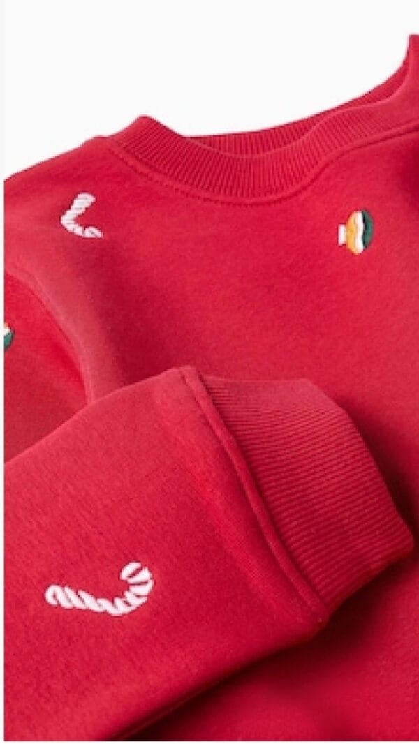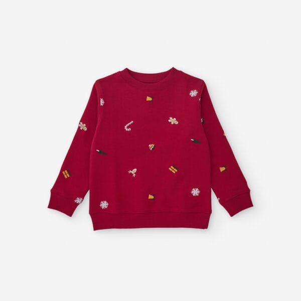 Sudadera navideña unisex de la marca Zippy, en color rojo con divertidos bordados festivos. Cálida, cómoda y perfecta para celebrar en familia.