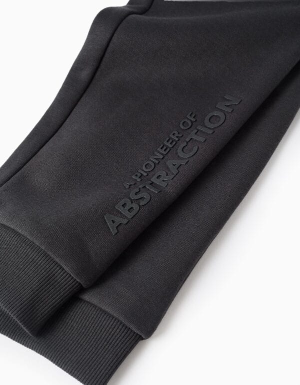 Pantalón tipo jogger para niño en color gris oscuro, confeccionado en suave felpa de algodón. Cuenta con cintura elástica con cordón ajustable, bajo engomado y bolsillos laterales. Incorpora una inscripción en relieve en una de las perneras: “A Pioneer of Abstraction”. Ideal para crear looks urbanos y cómodos para el cole o el tiempo libre.