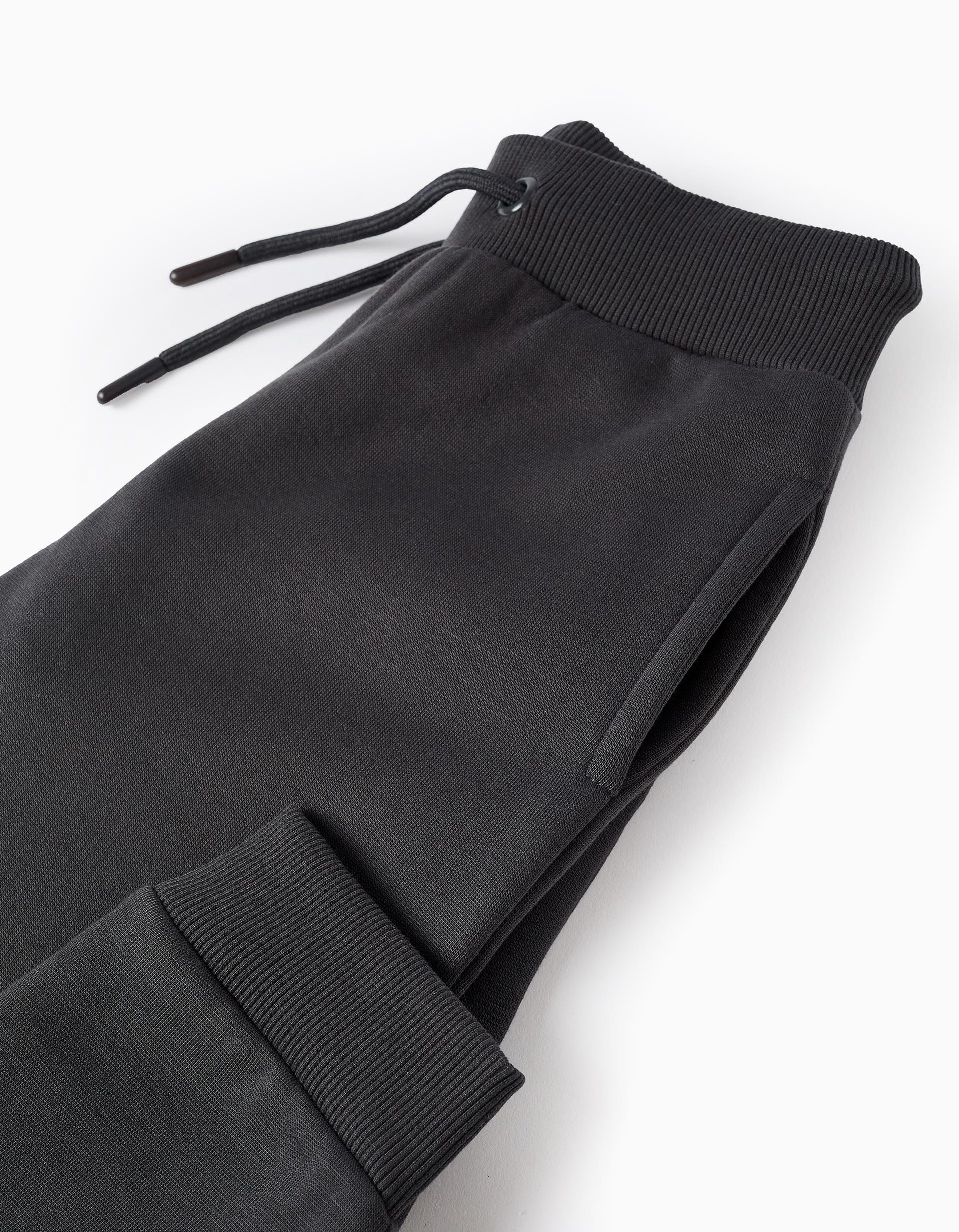 Pantalón jogger para niño en color gris oscuro con bajo engomado, cintura elástica ajustable y detalle de texto en relieve en la pernera. Comodidad y estilo para el día a día.