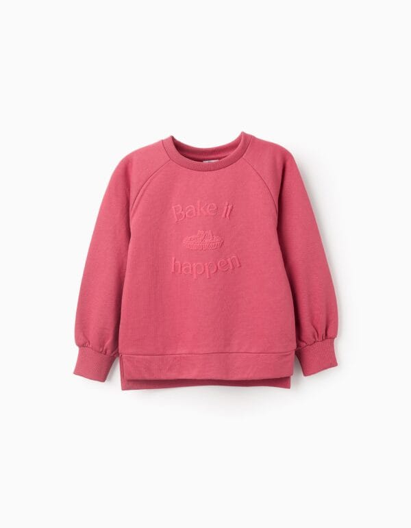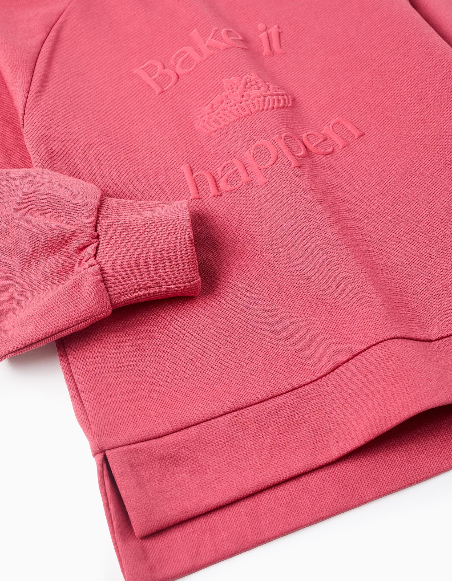 Sudadera rosa para niña con mensaje en relieve «Bake it happen». Cómoda, original y perfecta para el día a día