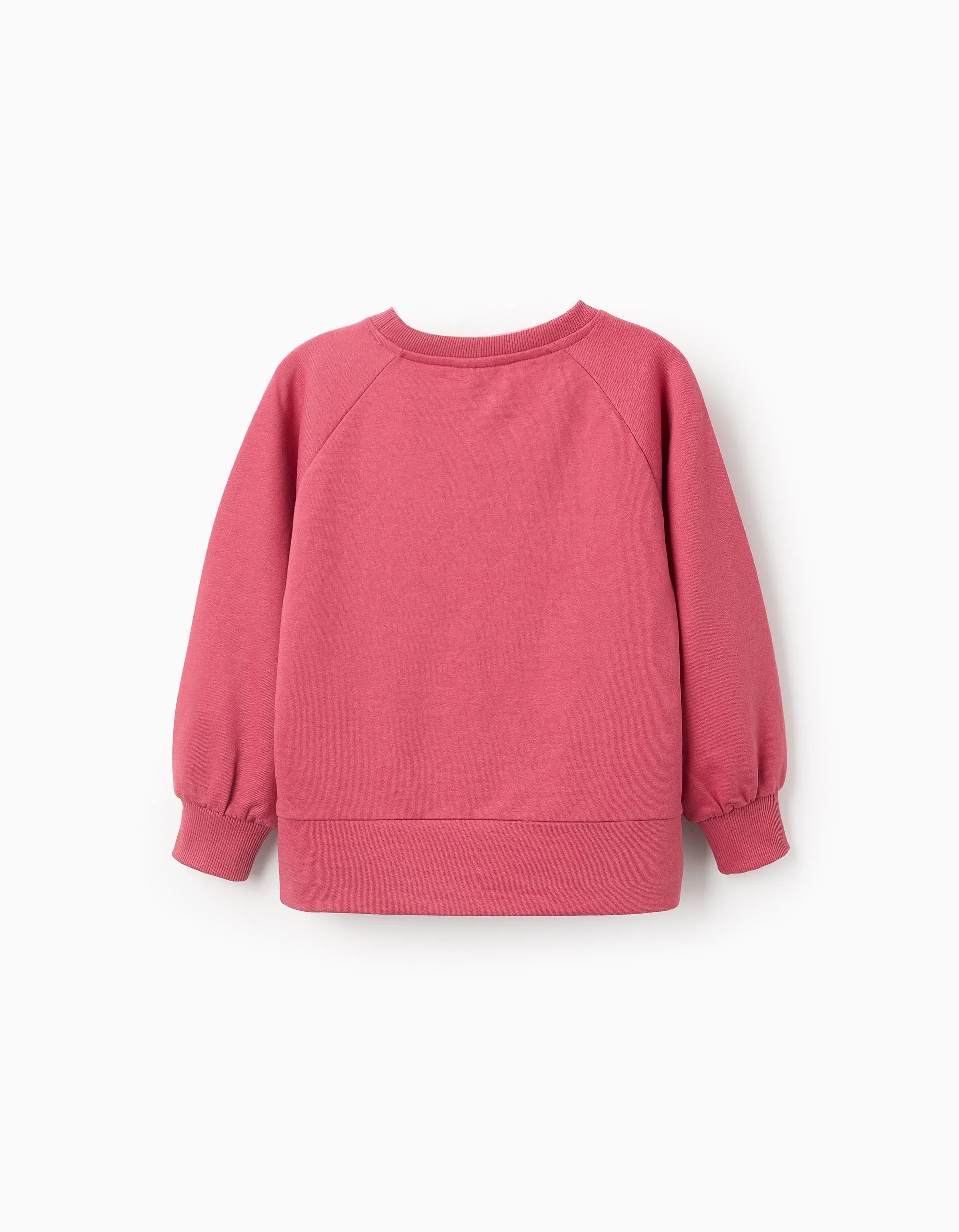 Sudadera de niña en color rosa oscuro con diseño bordado en relieve que incluye el mensaje “Bake it happen” y un dibujo de una tarta. Confeccionada en tejido suave y afelpado por dentro, ideal para los días más frescos. Corte recto, cuello redondo y puños de canalé. Bajo trasero ligeramente más largo con abertura lateral para mayor comodidad. Una prenda moderna, divertida y muy cómoda para el cole o el fin de semana.