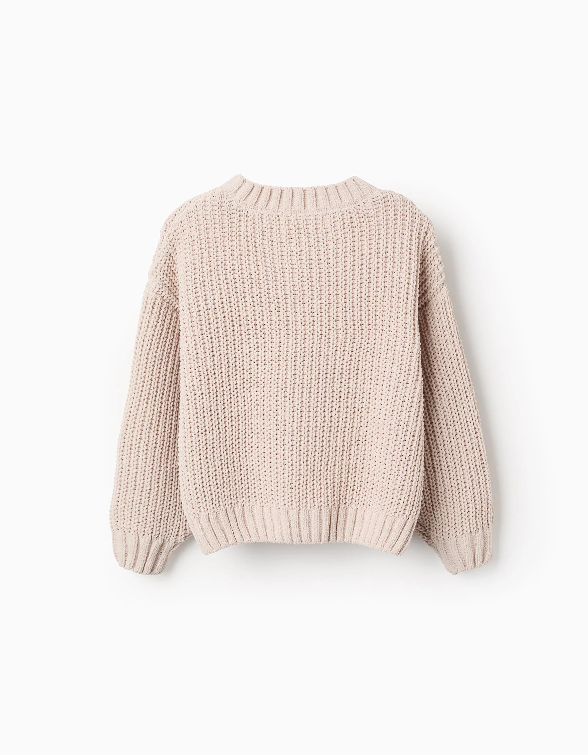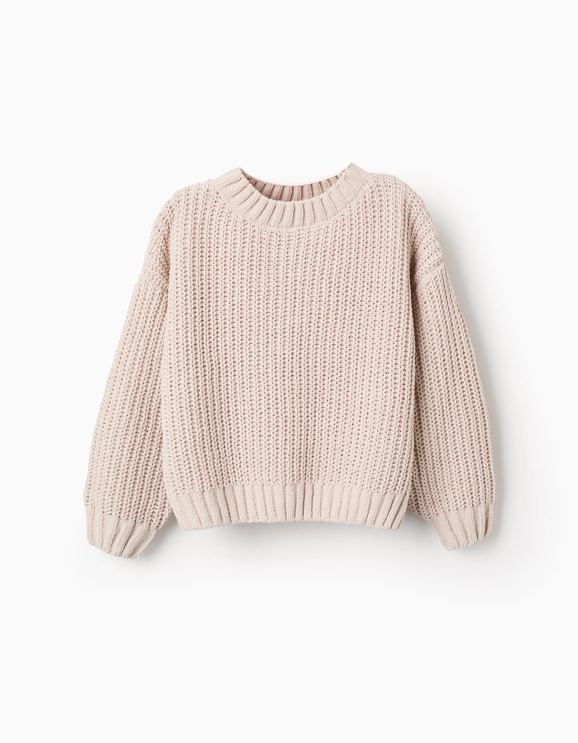 Jersey de punto grueso en color beige para niña, con cuello redondo y puños elásticos. Suave, calentito y cómodo para el día a día.