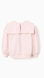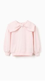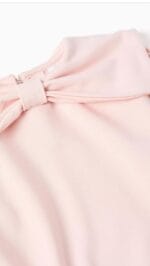 Sudadera de niña en color rosa claro confeccionada en felpa suave y agradable al tacto. Destaca por su original cuello babero rematado en un lazo grande, que le da un toque dulce y elegante. Manga larga con puños elásticos, bajo con canalé y cierre trasero con cremallera oculta para facilitar la puesta. Una prenda versátil, perfecta para el día a día o para ocasiones especiales.