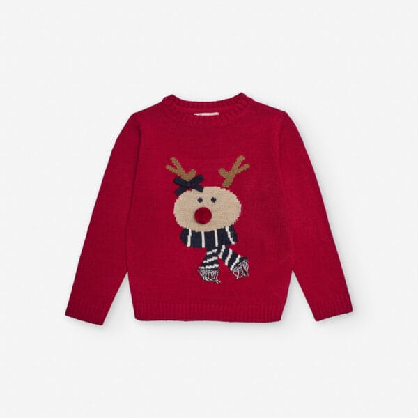 Jersey navideño para niña de la marca Zippy, en color rojo con dibujo de reno y detalles divertidos en relieve.