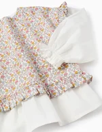 Blusa de niña de la marca Zippy con cuerpo estampado de flores multicolor y mangas blancas lisas. El diseño presenta volantes en los hombros y en el bajo, que le dan un aire romántico y delicado. Las mangas largas abullonadas terminan con puño elástico y volante, y el bajo asimétrico en doble capa aporta movimiento. Cierre en la espalda con botón. Ideal para combinar con pantalones o faldas en looks especiales o casuales.