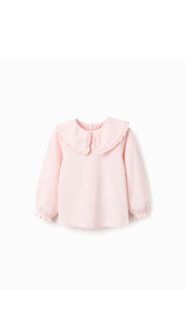 Camiseta de niña Zippy en color rosa claro, con cuello grande volanteado y mangas abullonadas. Suave, cómoda y con un toque romántico.