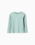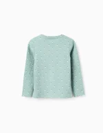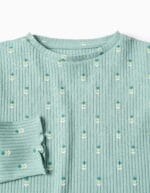 Camiseta de niña en tejido canalé verde con delicado estampado de pequeñas flores en tonos blanco, azul y amarillo. De manga larga y cuello redondo, ofrece un ajuste cómodo y un estilo encantador para combinar con cualquier parte de abajo. El tejido elástico se adapta suavemente al cuerpo, siendo perfecta para uso diario durante entretiempo o invierno.
