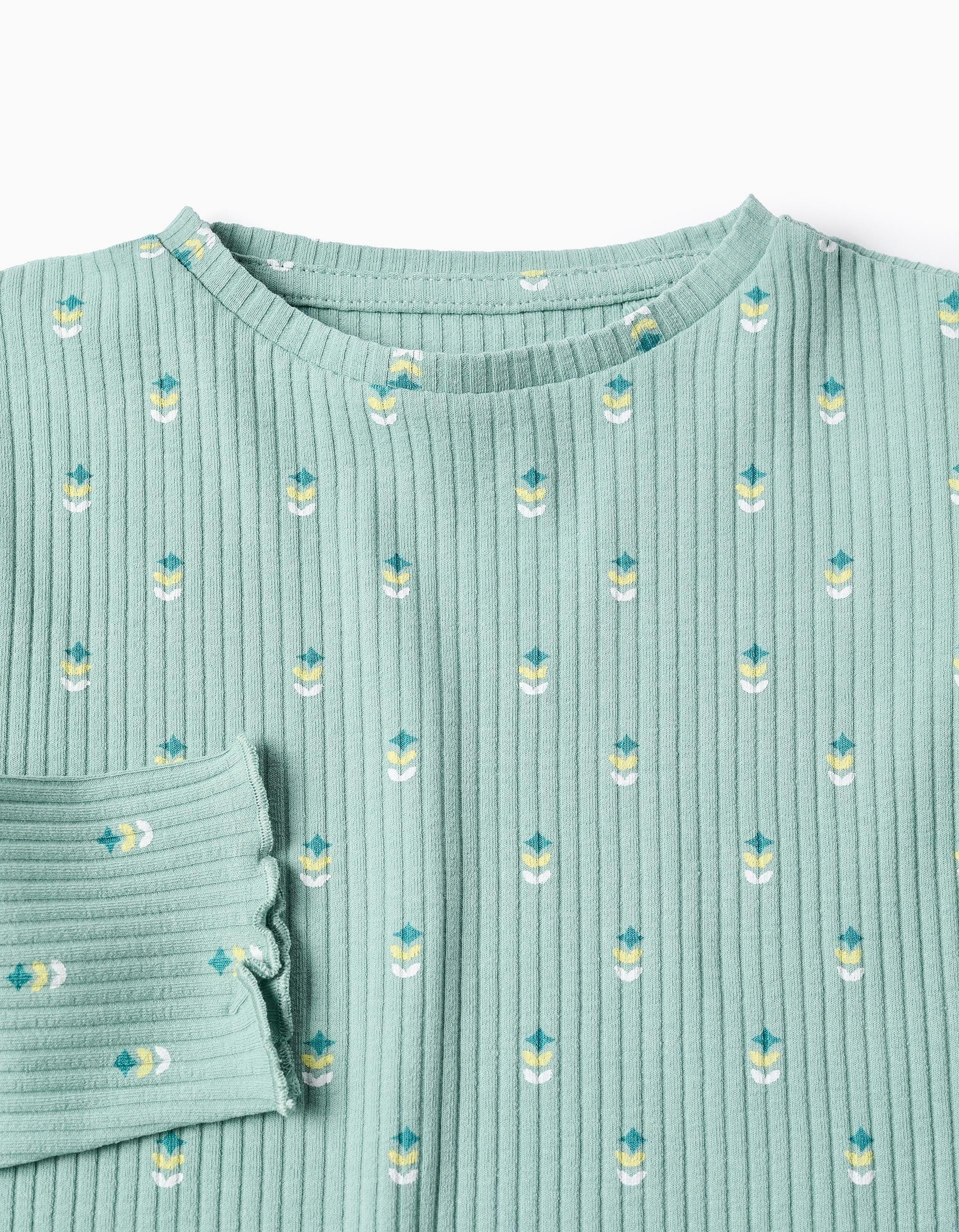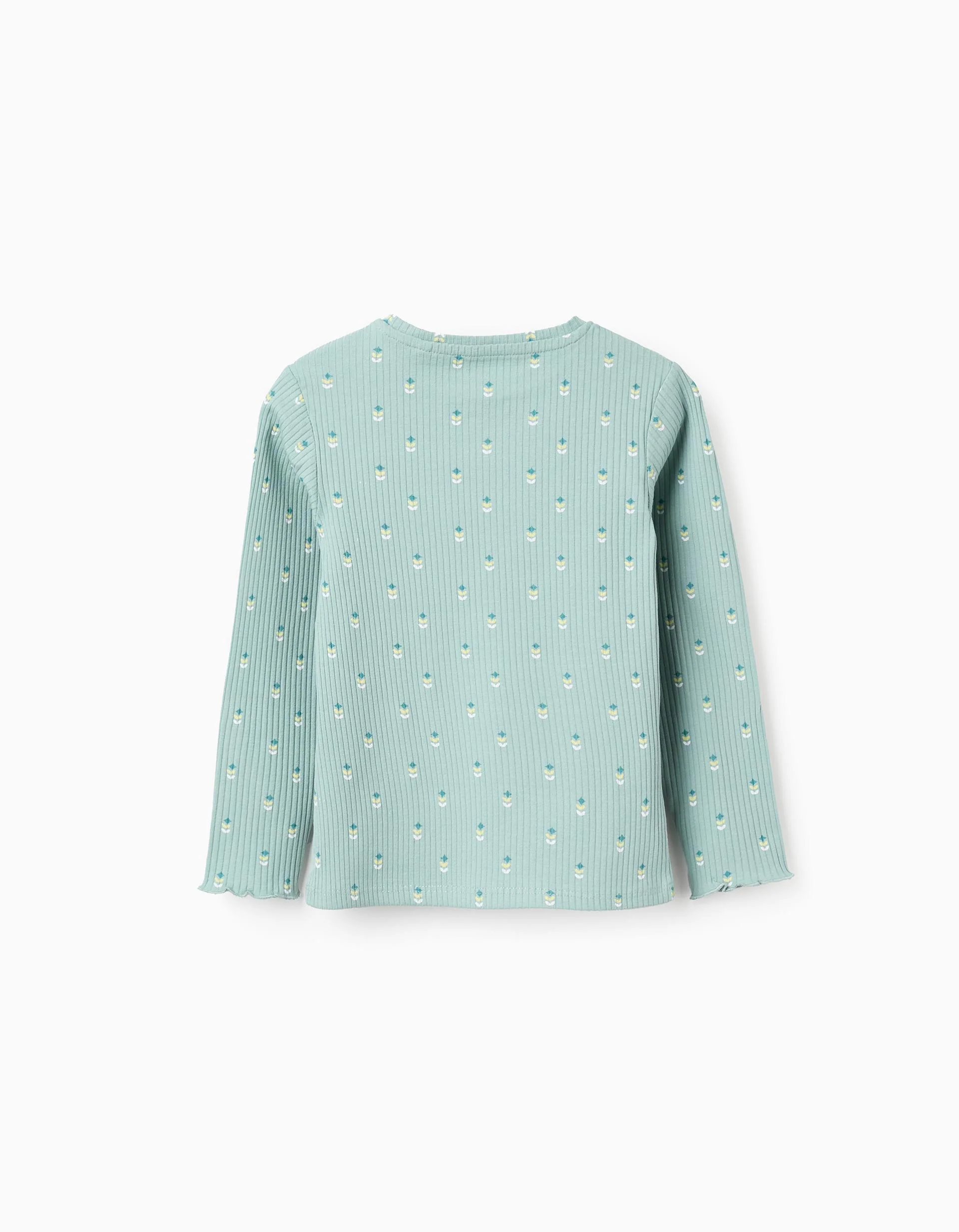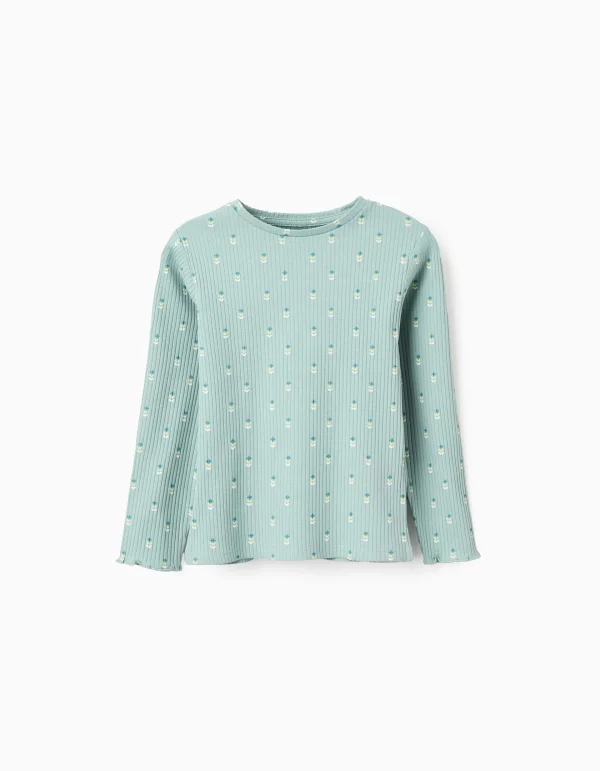 Camiseta de manga larga para niña en tejido de canalé verde con estampado floral. Ideal para el día a día.