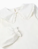 Blusa blanca para niña de manga larga con cuello bebé adornado con delicados volantes. Ideal para ocasiones especiales o looks clásicos del día a día.