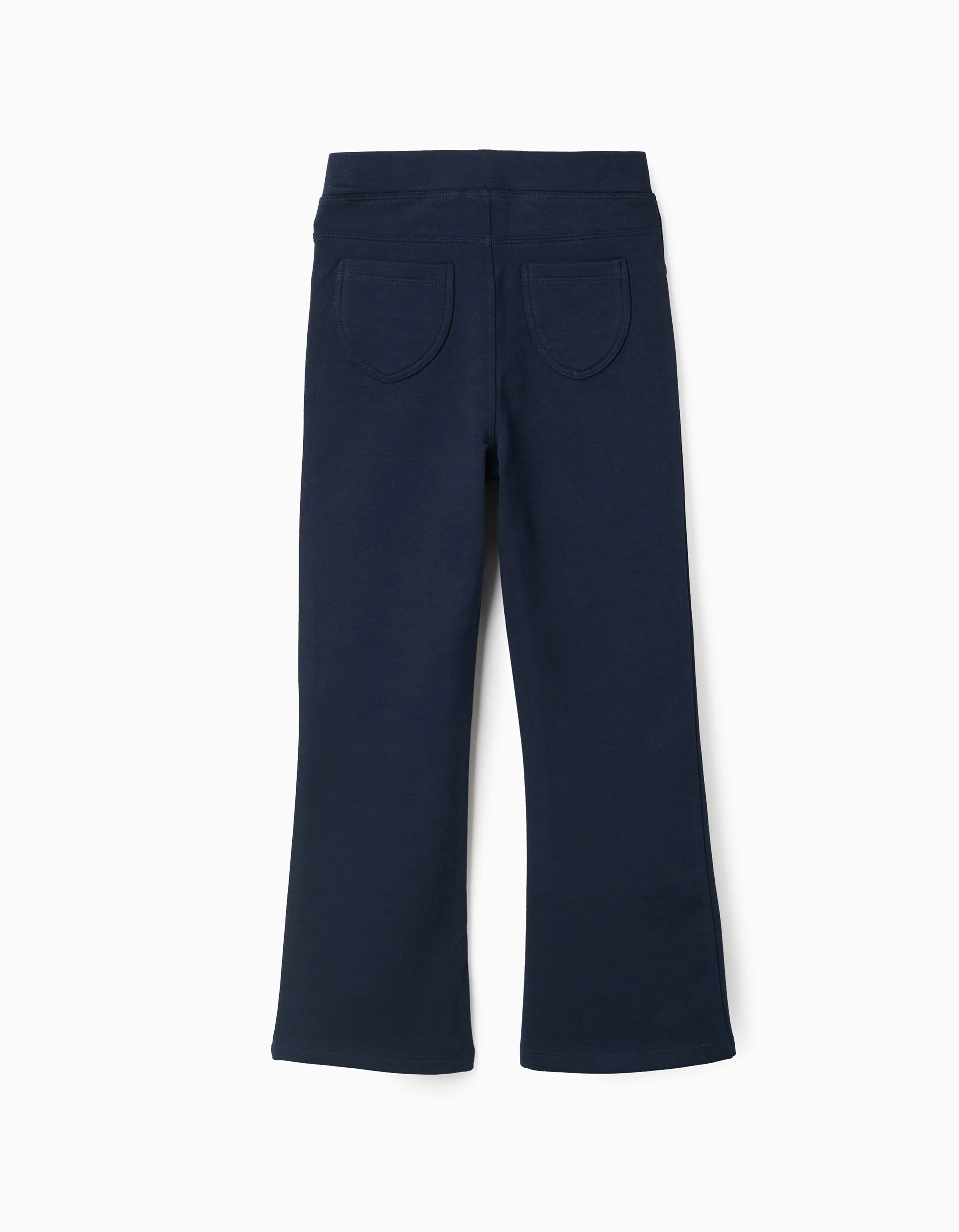 Pantalón infantil acampanado para niña, disponible en rosa y azul marino. Cintura elástica ajustable y bolsillos decorativos. Comodidad y estilo para el día a día.